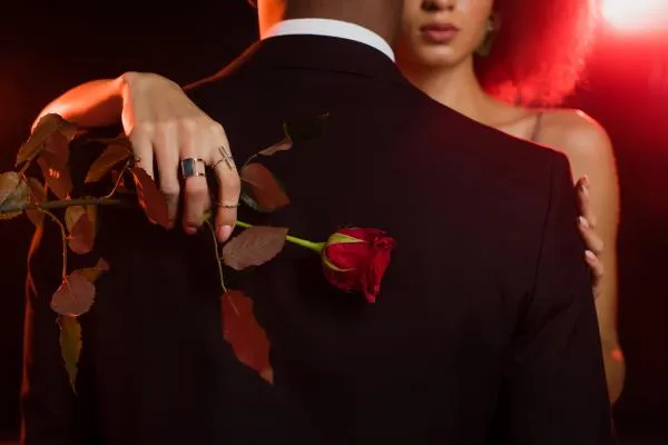 black couple in formal clothing with woman protectively holding a rose to his back