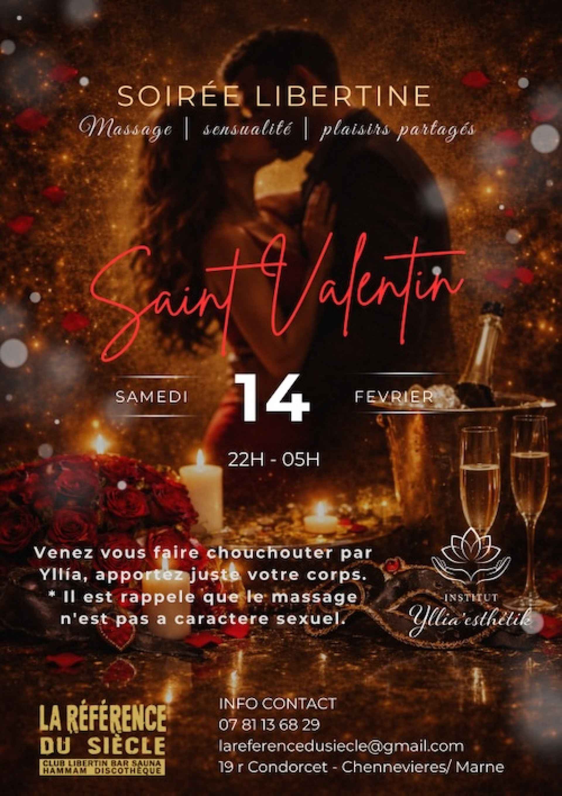 Samedi 14 Février 2026 À l’occasion de la Saint-Valentin, nous vous invitons à vivre une soirée placée sous le signe de la sensualité, de la complicité et du lâcher-prise. Dans une ambiance chic, feutrée et délicieusement coquine, laissez-vous porter par une atmosphère où les regards s’attardent, les corps se rapprochent et les envies s’expriment en toute liberté Collaboration bien-être – Yllia’Esthétik Yllia apporte son savoir-faire en massage bien-être, alliant douceur, sensualité et détente, pour une expérience sensorielle raffinée et immersive.